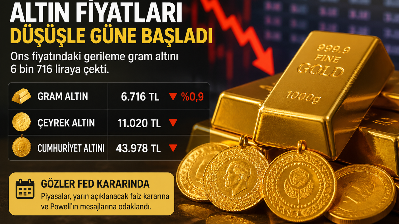 Önceki günü yüzde 0,5 düşüşle 6 bin 778 liradan tamamlayan gram altın, yeni güne de negatif başladı. Saat 09.30 itibarıyla yüzde 0,9 oranında gerileyen gram altın 6 bin 716 lira seviyesine indi. Aynı dakikalarda çeyrek altın 11 bin 20 liradan, cumhuriyet altını ise 43 bin 978 liradan işlem gördü.