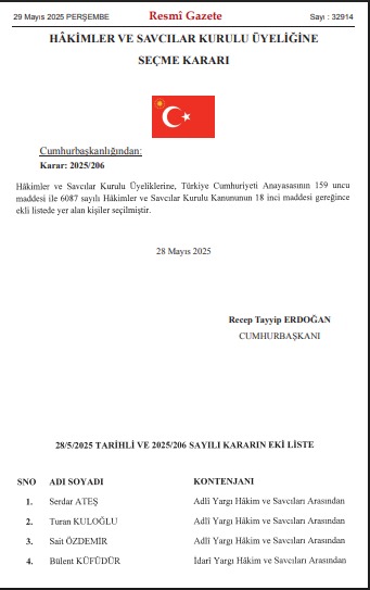 Cumhurbaşkanı Recep Tayyip Erdoğan, Hakimler ve Savcılar Kurulu’nda (HSK) 7 Haziran’da görev süresi dolacak dört üyenin yerine yeni atamalar gerçekleştirdi. Resmî Gazete’de yayımlanan karara göre, Serdar Ateş, Turan Kuloğlu, Sait Özdemir ve Bülent Küfüdür HSK’nin yeni üyeleri oldu.