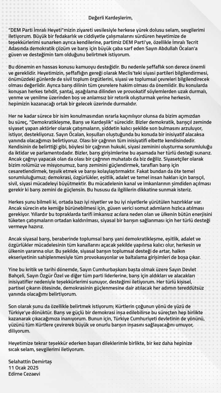 DEM Parti heyetinin açıklamasına göre, MHP Genel Başkanı Devlet Bahçeli’nin çağrısıyla başlatılan yeni süreç hakkında Demirtaş’ın desteği tam. Heyet üyelerinden Sırrı Süreyya Önder, Demirtaş ve diğer tutuklu isimlerle yapılan görüşmenin ardından, "Sağlık durumları ve moral durumları çok iyi. Bu bizim için en önemli şeydi. Demirtaş ve diğer arkadaşlarımız, sürece tam destek verdiklerini belirttiler" şeklinde konuştu.