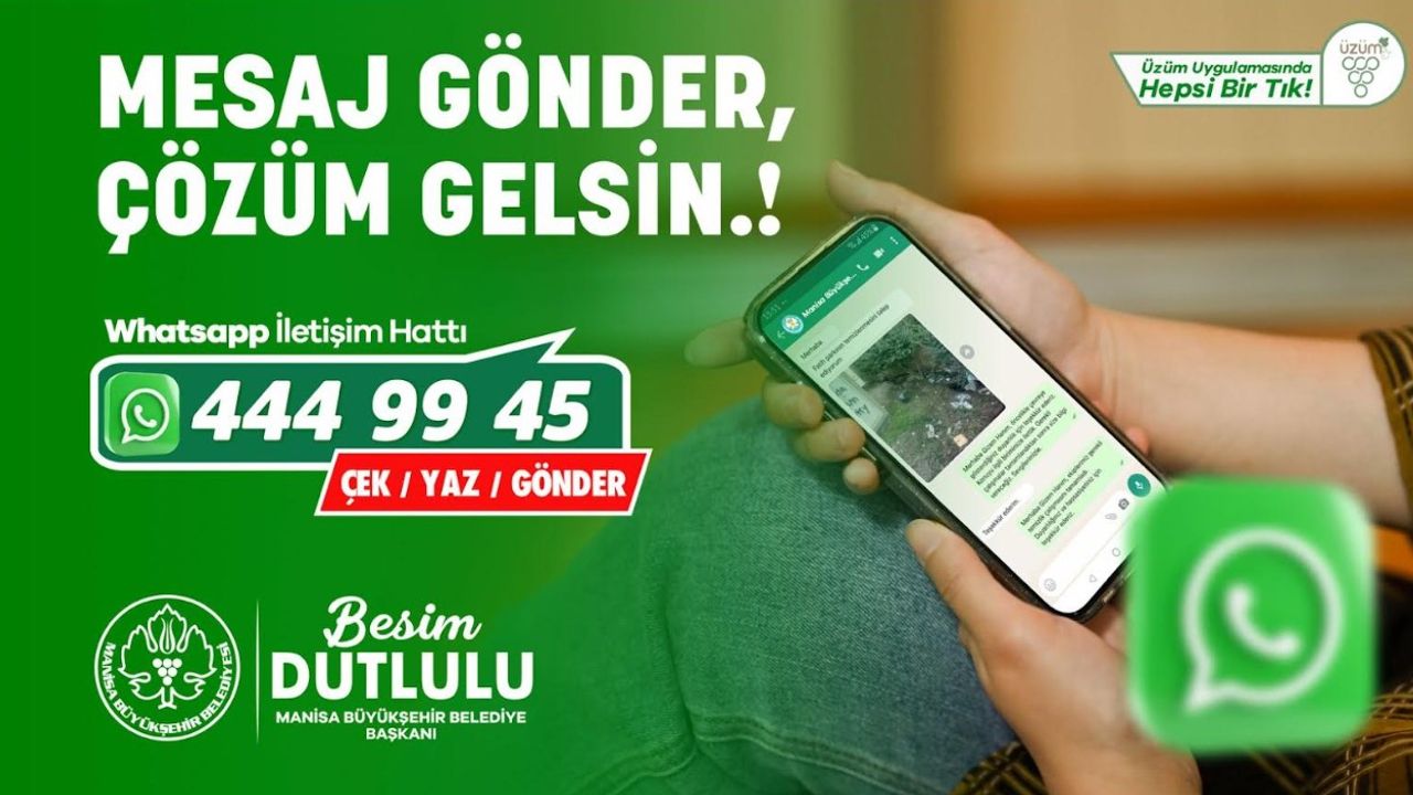 Vatandaşların, belediye ile iletişimlerini kolay ve hızlı hale getirmeyi amaçlayan Manisa Büyükşehir Belediyesi, dijital kanal üzerinden vatandaşların Büyükşehir Belediyesi’ne ulaşabilmesi için Whatsapp hattını (444 99 45) vatandaşların hizmetine sundu. Yeni sistem sayesinde vatandaşlar, yalnızca birkaç tıklamayla belediyeye ulaşabiliyor. Hem WhatsApp hem de Üzüm uygulaması üzerinden erişilebilen bu dijital hat, iletişimi hızlı, pratik ve etkileşimli hale getiriyor.