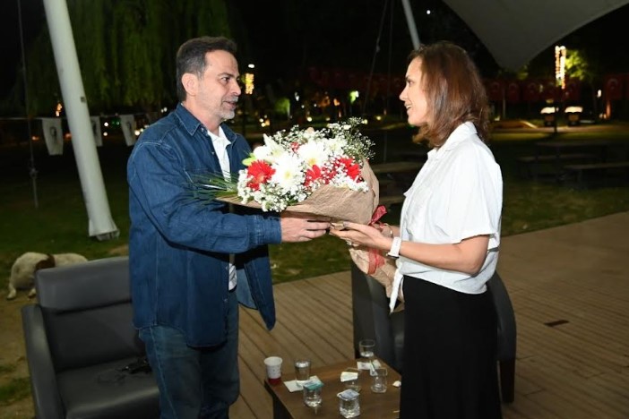 Söyleşinin ardından Büyükşehir Belediyesi Halk Eğitim Şube Müdürü Serap Gücüyen, Nasuh Mahruki’ye teşekkür ederek çiçek takdim etti.