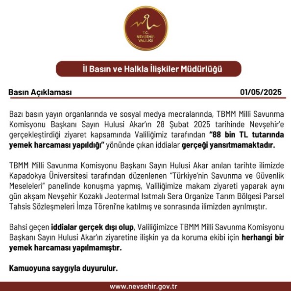 Nevşehir Valiliği, TBMM Milli Savunma Komisyonu Başkanı ve AK Parti Kayseri Milletvekili Hulusi Akar’ın 28 Şubat'taki Nevşehir ziyaretine ilişkin ortaya atılan “88 bin TL’lik yemek harcaması yapıldığı” yönündeki iddiaları yalanladı. Söz konusu iddialar sosyal medyada gündem olmuş, kamuoyunda tartışma yaratmıştı.