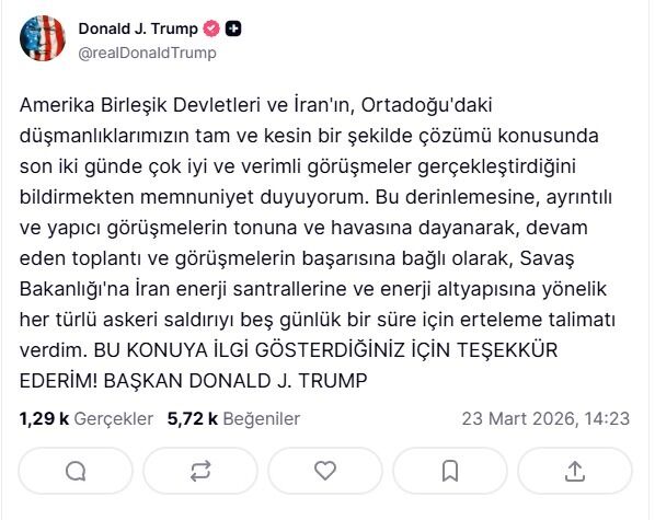 ABD Başkanı ayrıca, sürecin seyrine bağlı olarak askeri planlamalarda değişikliğe gidildiğini belirterek, “Devam eden görüşmelerin başarılı olmasına bağlı olarak İran’ın enerji santralleri ve altyapısına yönelik tüm askeri saldırıların beş gün süreyle ertelenmesi talimatını verdim” dedi.
