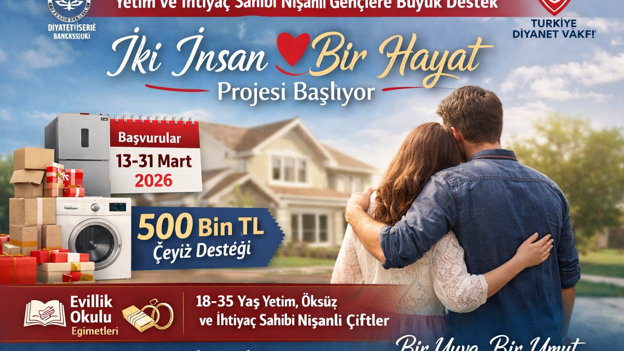 TDV’den yapılan açıklamaya göre proje, evlilik sürecindeki maddi yükü hafifletmeyi ve gençlerin yuva kurmasını teşvik etmeyi amaçlıyor. Bu kapsamda, başta ev eşyası olmak üzere çeşitli temel ihtiyaçlar karşılanacak. En dikkat çekici destek ise, 1 Haziran 2026 tarihinden itibaren nikâhlarını müftülüklerde kıydıran ve projeden yararlanmaya hak kazanan çiftlere verilecek 500 bin liralık geri ödemesiz çeyiz yardımı olacak.